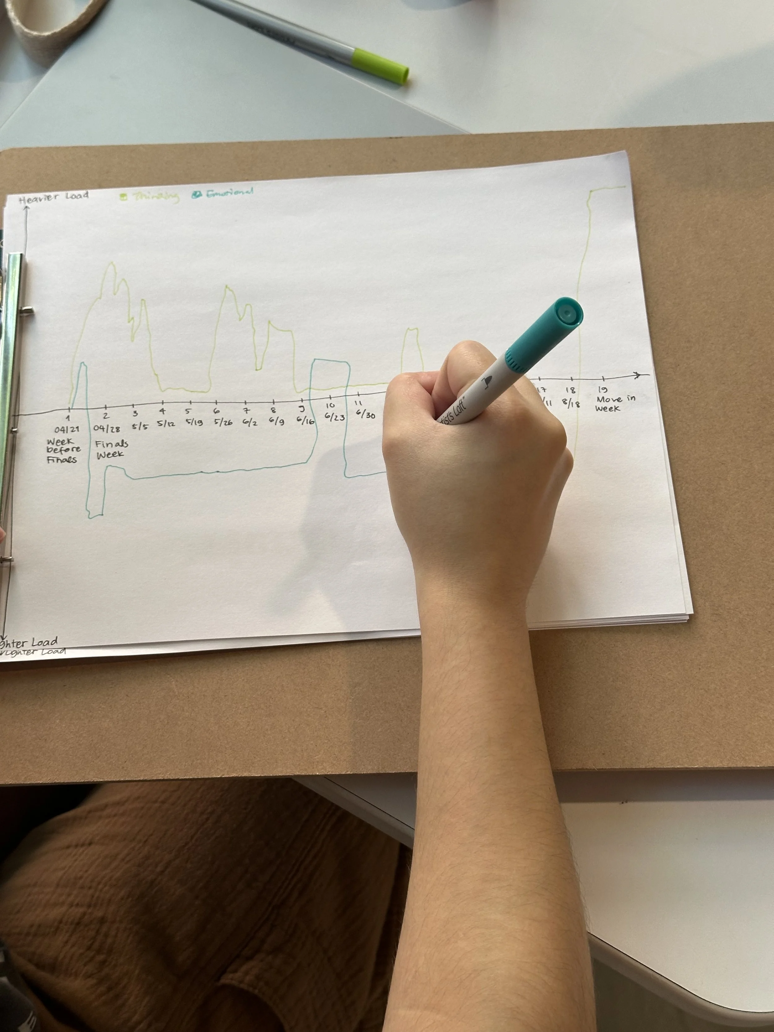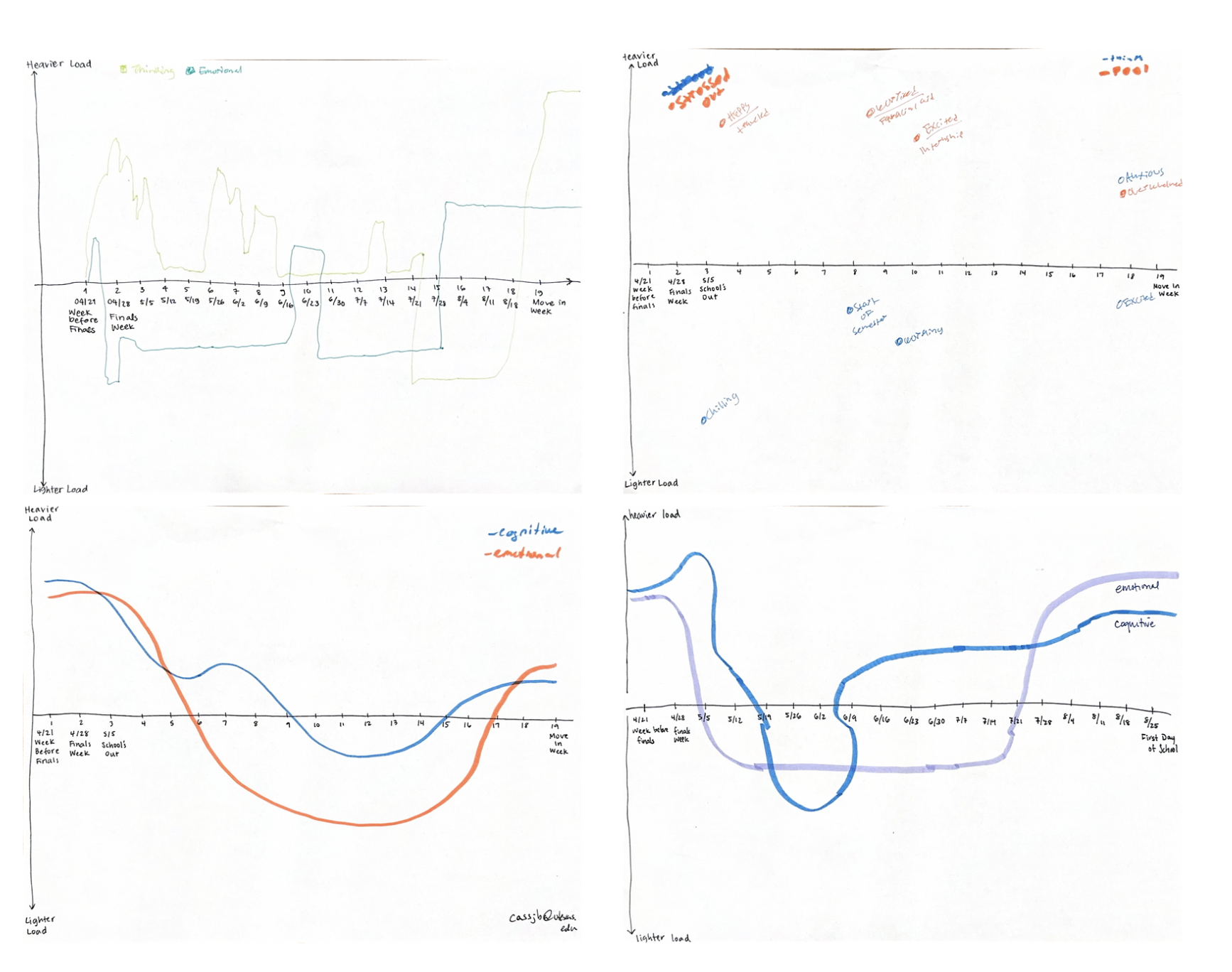 During the later prototyping phase, we realized we needed to better understand the students’ summer rhythm in terms of their cognitive and emotional loads. We surveyed 7 students and had them fill out a graph depicting their cognitive and emotional loads over the course of the past summer (in different colors).
