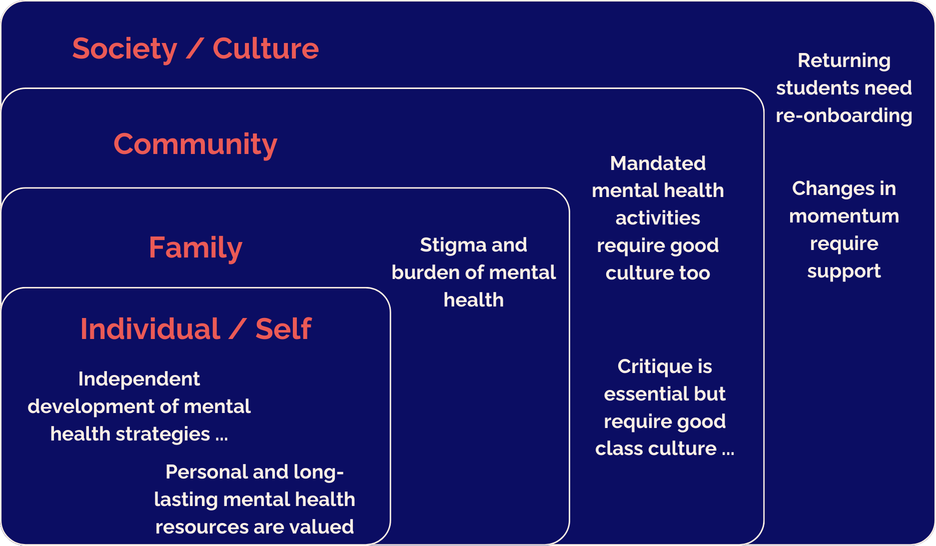 The ecological model allowed us to see which insights would be easiest and most impactful in the lives of the students. We recognize that culture changes require extensive time to fully implement, and community changes require large-scale buy-in from professors, students, deans, and other parties. However, more individual- and family-dependent insights may not be as useful to the wider CoFA student population.