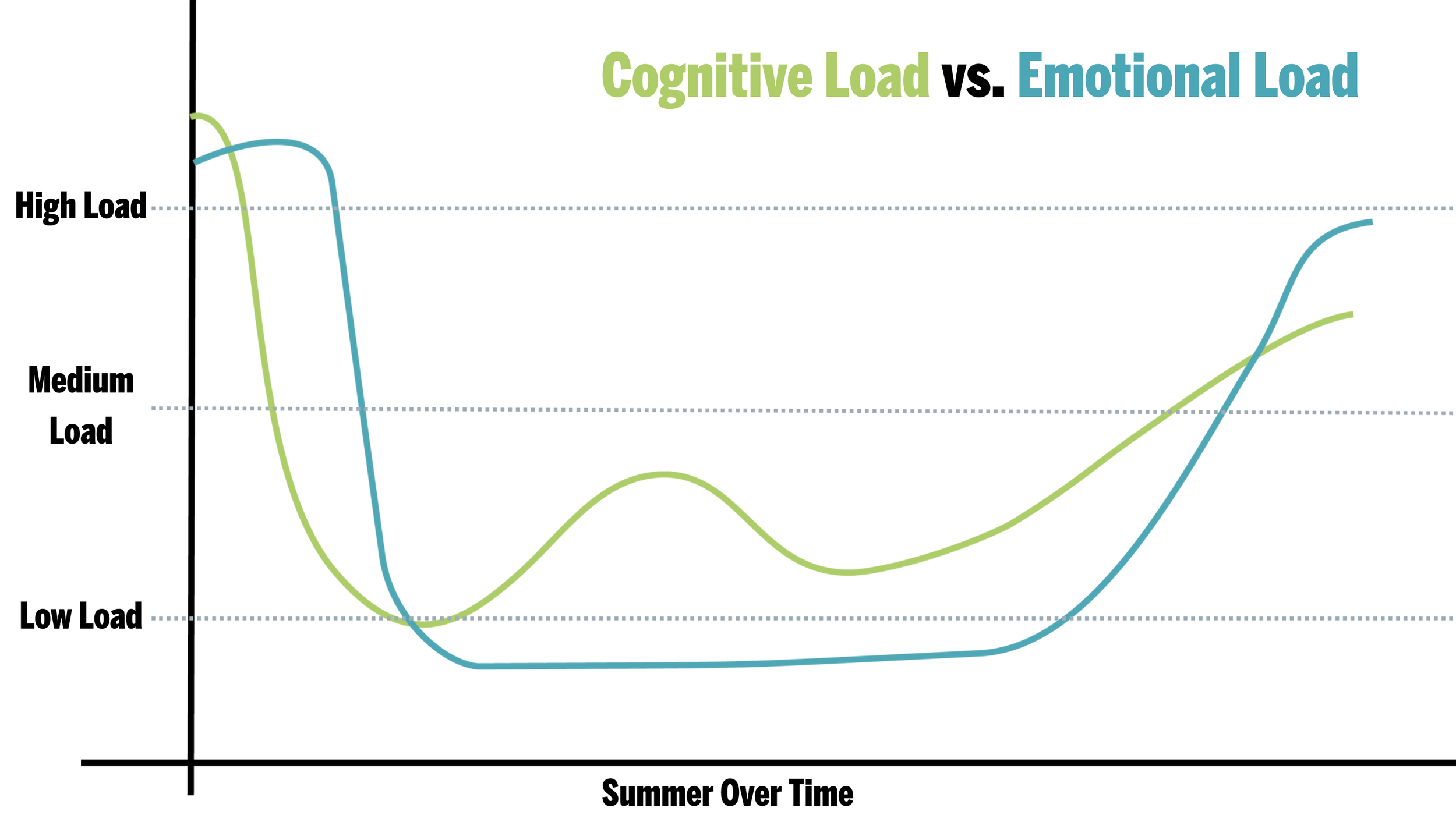 We compiled these load maps into a cohesive picture of a student’s summer: students have a high cognitive and emotional load during finals, but while the cognitive load decreases soon after the end of finals, the emotional load of the semester ending continues and later drops off to lower than students’ cognitive load.